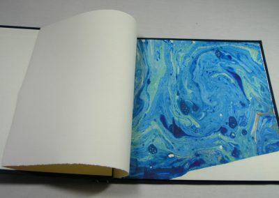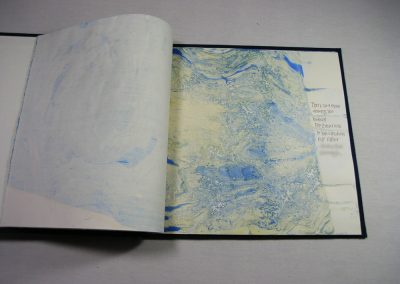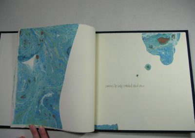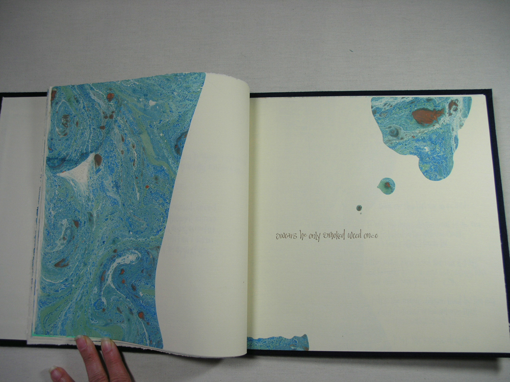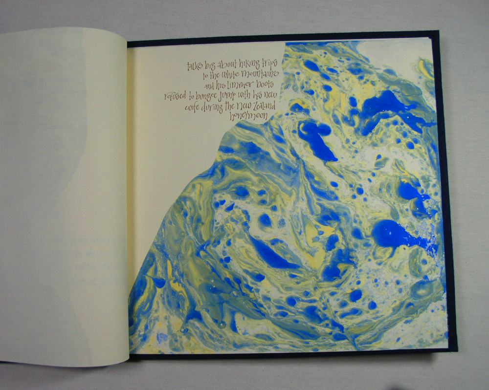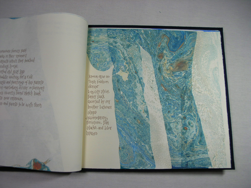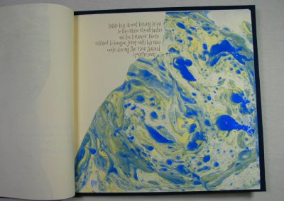 Pat Faust and I marbled the book pages. I chose a non-traditional lettering style to capture the joy of the words. Oil painter, Bill Simpson created the painting of New Jersey on the cover. Pat Faust designed and built the clamshell box and bound the book. Selections of the book are shown here.