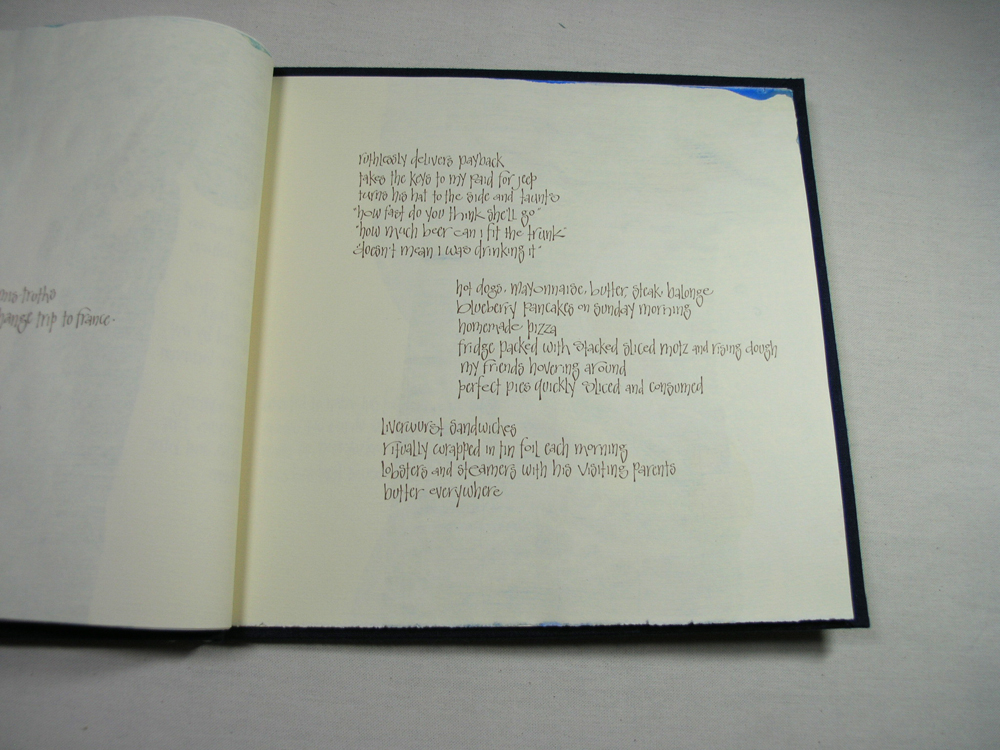 What I love about art books is the ability to celebrate and enjoy long texts. I love the way a book can be held and slowly savored by oneself or with a loved one. One doesn’t need to stand at the wall looking at a long text that has been framed. Holding a book opens the door to conversation, sharing of stories and reminiscing.  Each page can be unique in its layout offering a surprise with every turn. By slowing down the consumption of the text, the words can be savored and absorbed rather than raced through.