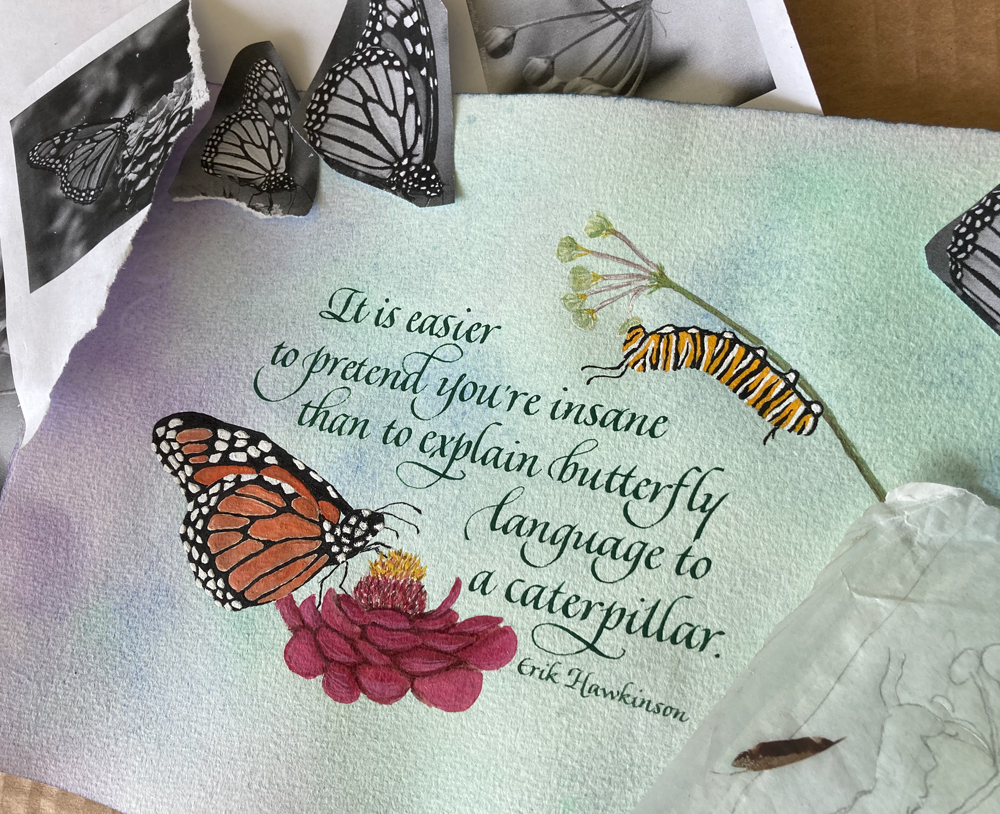 Top photo shows the array of the extensive packet of handouts we will use during the 6 week course. The journals show the book format we are creating, the butterfly piece is a sample of my italic with simple illumination components and the “Lokah” is a sample of my italic lettering done with brush on the wall of a yoga studio, the length of the text was about 10′ long.