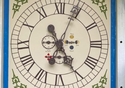 Here, I’m lettering on the soffits of St. Mary’s Catholic Church in Bethel, Connecticut. The length of the writing area is 120′ and features two Bible verses, Luke 10:27 and Micah 6:9. I lettered from a scaffold. The copperplate-styled letters are edged with gold and flourishes fill the remaining spaces.